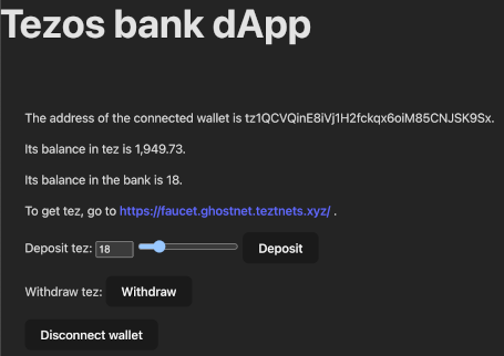 This tutorial shows you how to create a simple web application that uses Tezos. Specifically, this application will be the user-facing web front end for a bank application that accepts deposits and returns withdrawals of test tokens.