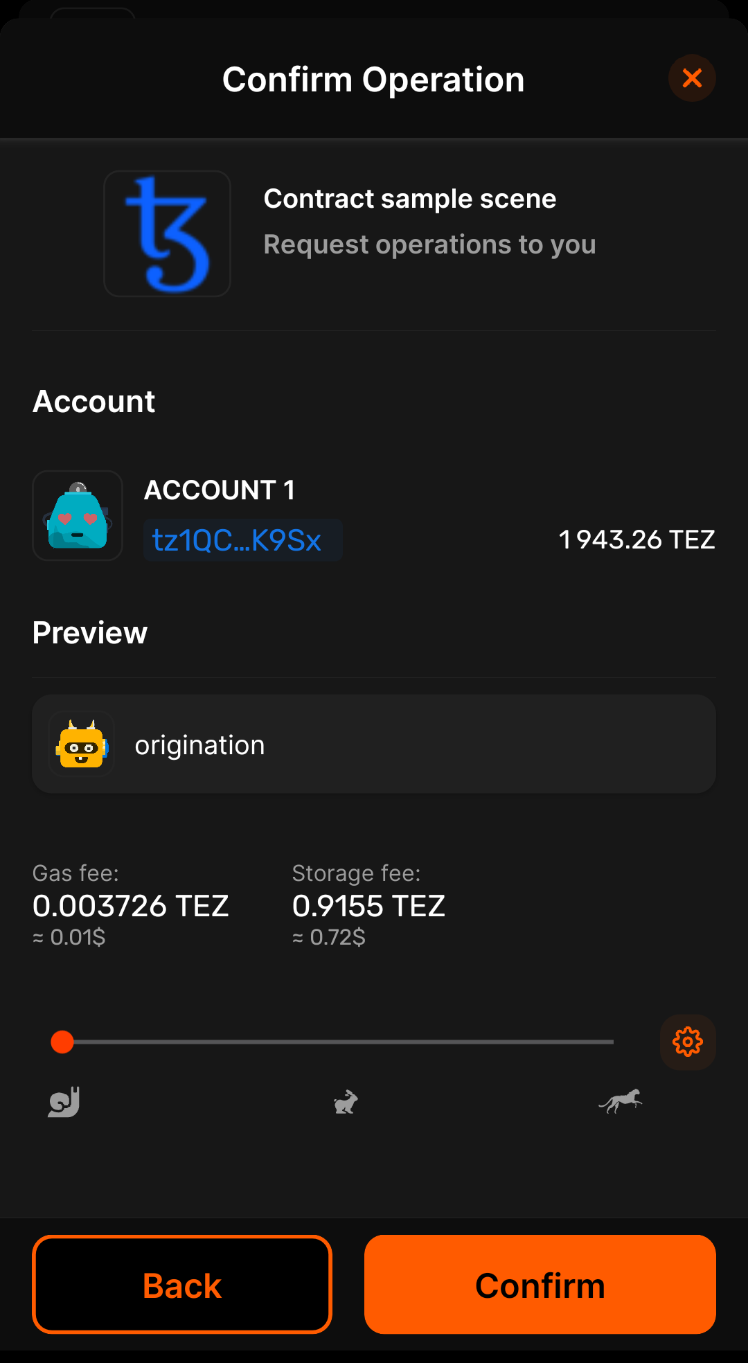 When you confirm the transaction in the wallet app, you must wait for the contract to be deployed on Tezos.