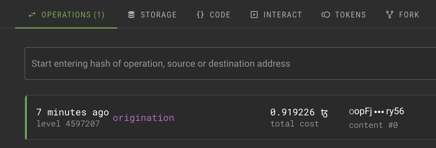 The block explorer shows information about the contract, including recent transactions, its source code, and the tokens it controls and their owners. Currently, the block explorer shows only the origination transaction, which deployed the contract:
